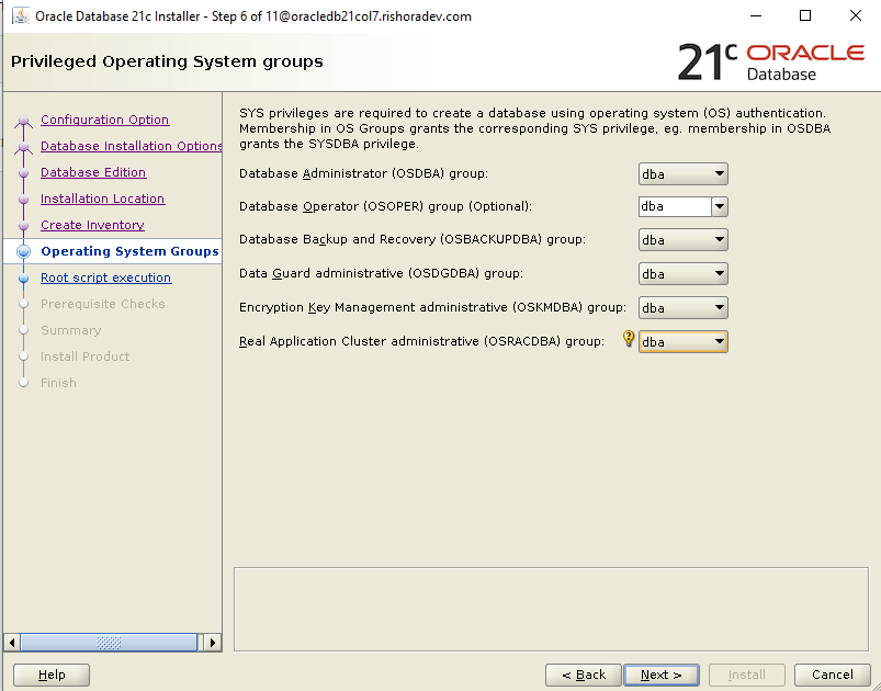 Set the Privileged Operating System groups. I chose dba for all the groups.