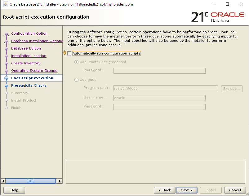Leave the Root script execution configuration with the default settings. In the final step of the installation, the system will prompt to connect to another terminal using the “root” user and run the scripts – orainstRoot.sh and root.sh.