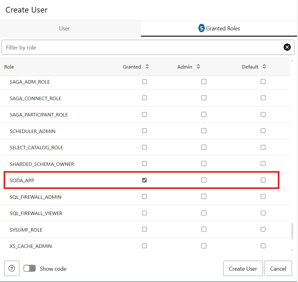 Navigate to the Granted Roles tab and add the SODA_APP role for the user, in addition to the default roles.