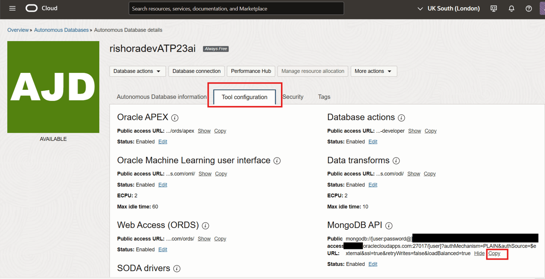 In order to connect to the Oracle Autonomous database using the MongoDB Shell, we first need to get the connection string. To get the connection string navigate to the Tool configuration tab on the Autonomous Database details page.