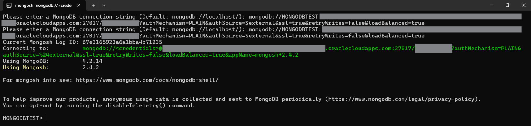 You can download the MongoDB Shell from here, if you have not already. Open the CLI and paste the connection string, when prompted, and press enter. And voila, we have just managed to connect to the Oracle Autonomous database through the MongoDB Shell.