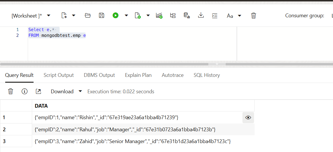 MONGODBTEST> db.emp.insertOne({empID:3, name:"Zahid", job:"Senior Manager"})
