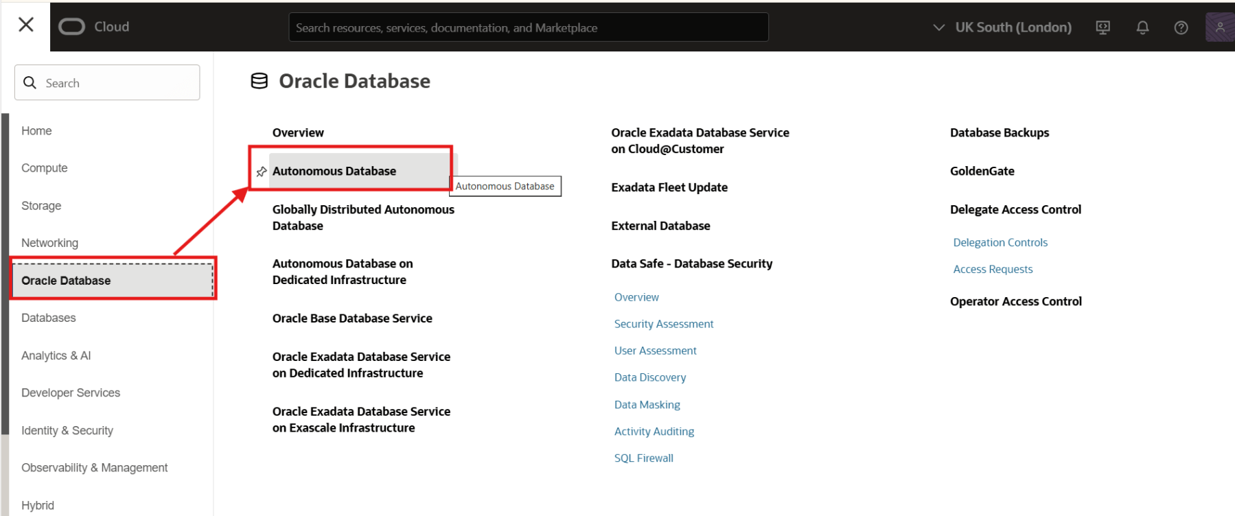 To create Oracle Autonomous Database 23ai, login to your OCI console and navigate to Oracle Database > Autonomous Database and click on Create Autonomous Database.