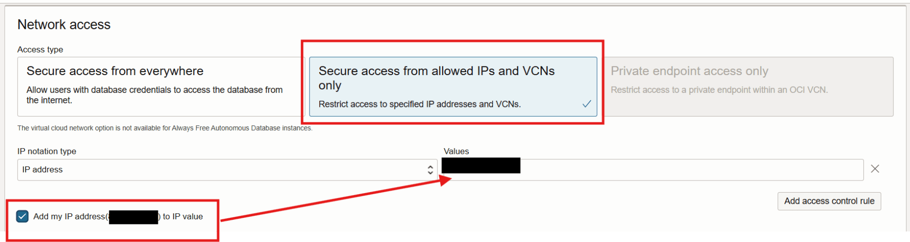 Scroll down to the Network access section, select Secure access from allowed IPs and VCNs only. Enable the Add my IP address checkbox. This should populate your IP address in the field highlighted below.