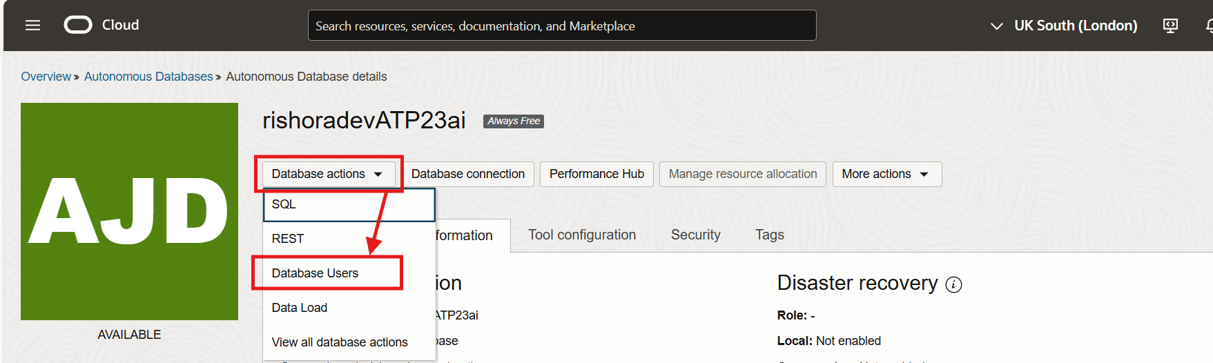 Our Autonomous Database is now created. Next, we will create an user.
