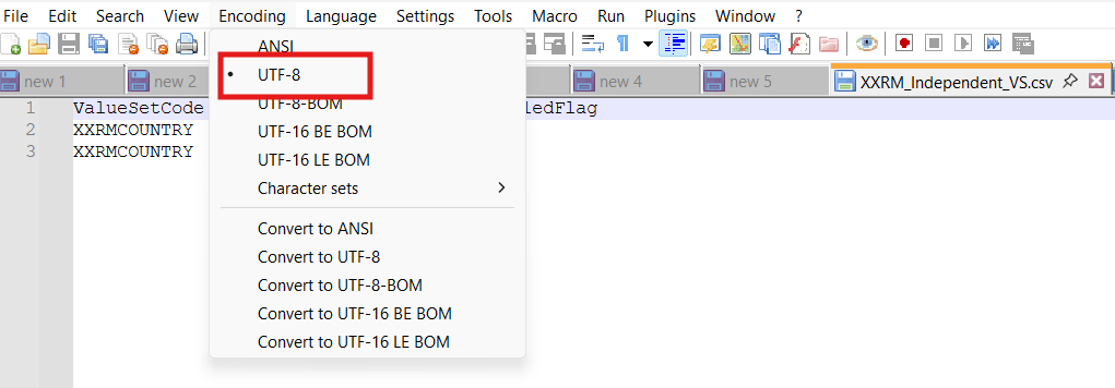 Once you have prepared the files, save the files in .csv format. Note that the files should be of UTF-8 encoding. I use Notepad++ for this purpose as shown below.