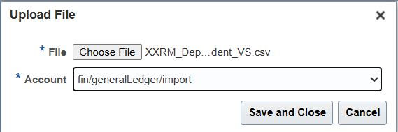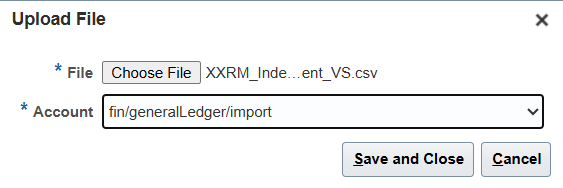 Select the relevant Account from the Account drop-down list. Here, we use ‘fin/generalLedger/import’. Then browse to and select your import file- first we upload the file for Independent Value Set. Click on Save and Close to complete the Upload.