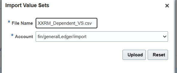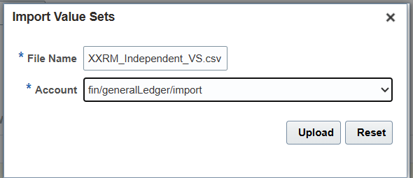 In Import Value Sets popup, type in the flat file name. Make sure you also type in the .csv extension. Then, select the Account name you used while uploading the files.