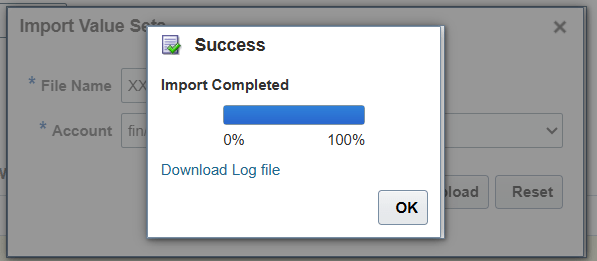 Click Upload. The status of the upload can be seen in the progress bar. You will see the Success message if the Value Set is imported successfully, else you will get an error.