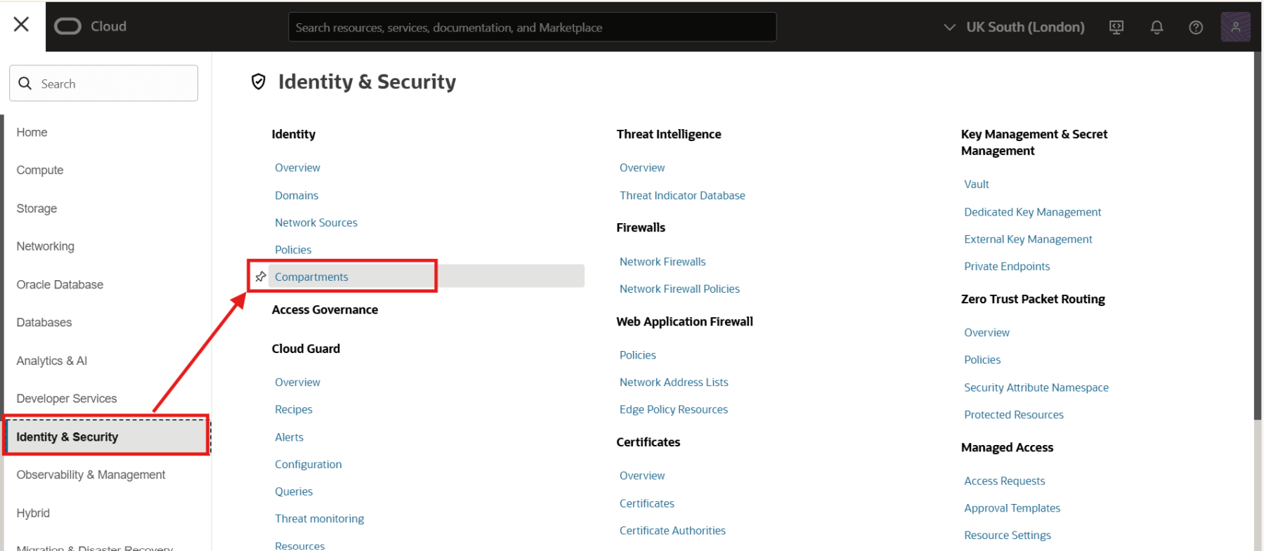 To create an Oracle Integration instance, you must first create a compartment. You can create the instance in the root compartment. However, it is recommended that you create the Oracle Integration instance in a child compartment. To create a child compartment under the root compartment, sign into your Oracle Cloud Infrastructure console. Then, click on the navigator menu and navigate to Identity & Security > Compartments.