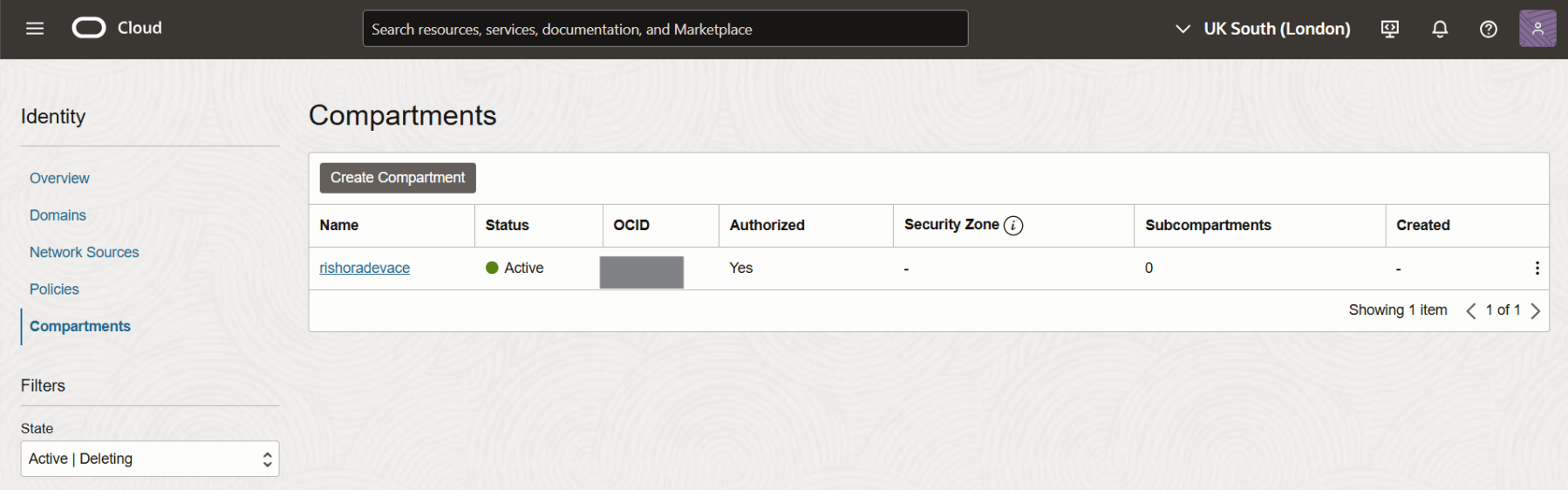 In the compartments page, all the active compartments would be listed. You should only see the root compartment if you have no other compartments created, as shown below.