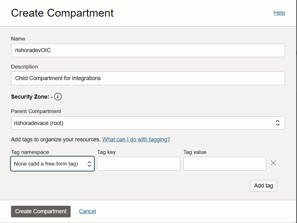 Type in the compartment name that is unique across all compartments in your tenancy. Enter a description for the compartment. Under Parent Compartment, chose the compartment under which you want to create the child compartment. Optionally, you can add Tags to organize and list resources based on your business needs. Click on Create Compartment.