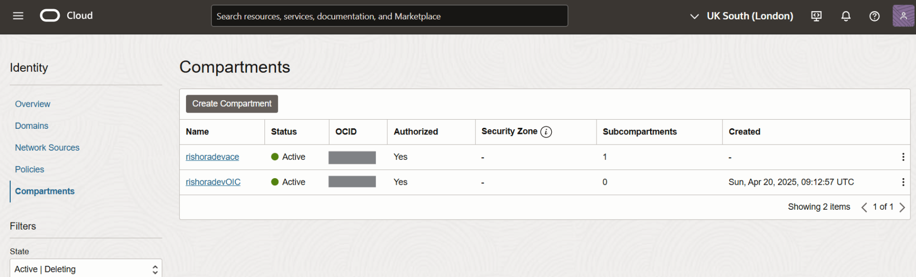 Once the compartment is created it should be listed.