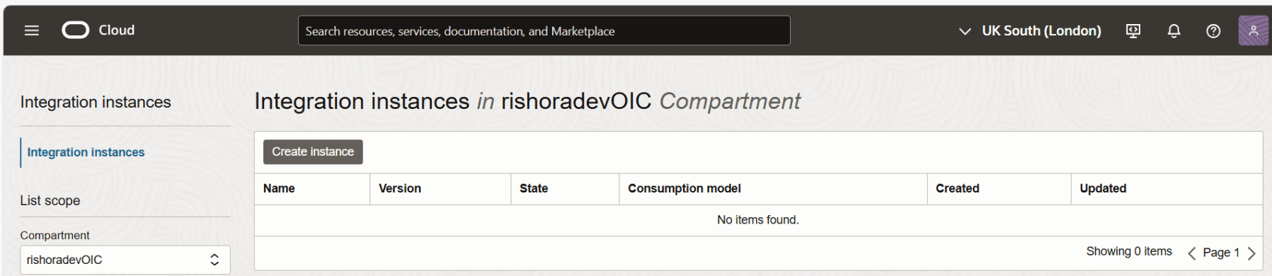 In the Integration Instances page, navigate through the compartment hierarchy and select the compartment in which you want to create the Oracle Integration Cloud instance.