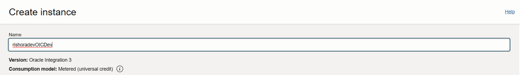 Enter a name for the instance. Oracle Integration 3 would be the default version. You can create a new Oracle Integration Gen 2 instance only if you have an existing Oracle Integration Gen 2 instance in the region. For Consumption model, typically, only one consumption model is displayed, but if multiple consumption models are available in your tenancy, select the one you want to use for this instance. In this case, Metered (universal credit) is the available option. Note that the Usage metrics are different for Oracle Integration versus Oracle Integration for SaaS.