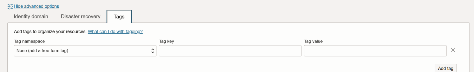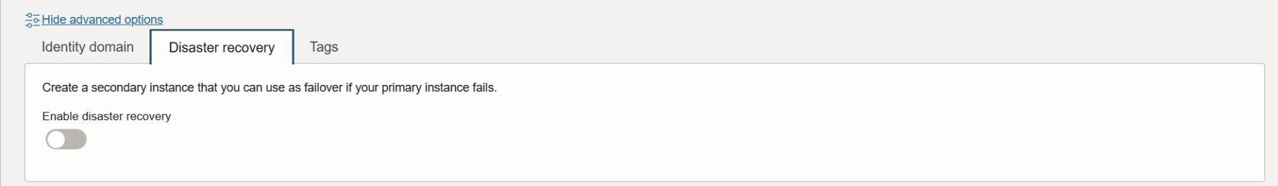 Under Show advanced options, you can configure Identity domain to associate this integration instance with a secondary identity domain. This allows you to manage all your instances in your tenancy from one domain, rather than having to sign into each domain to manage the associated instances.