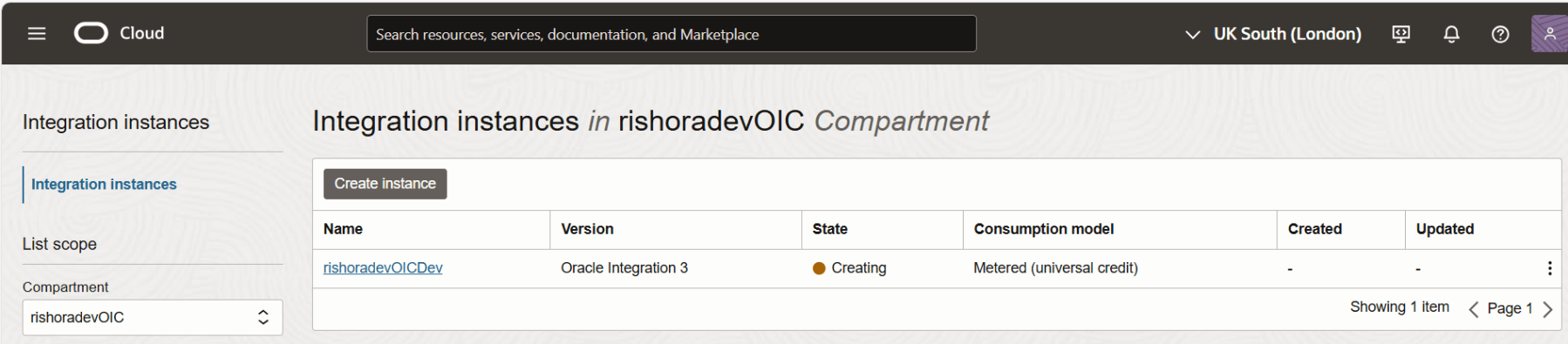 Next, click on Create. The instance takes a few minutes to get provisioned. You can check the status of the instance in the Integration instances page.