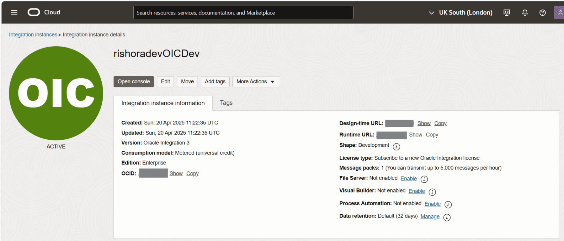 When instance creation completes successfully, the state of the integration instance shows as Active.