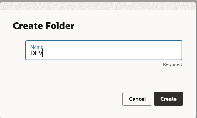 To create a new folder, click Create on the top-right-hand corner. Enter a valid folder name. Then click Create.
