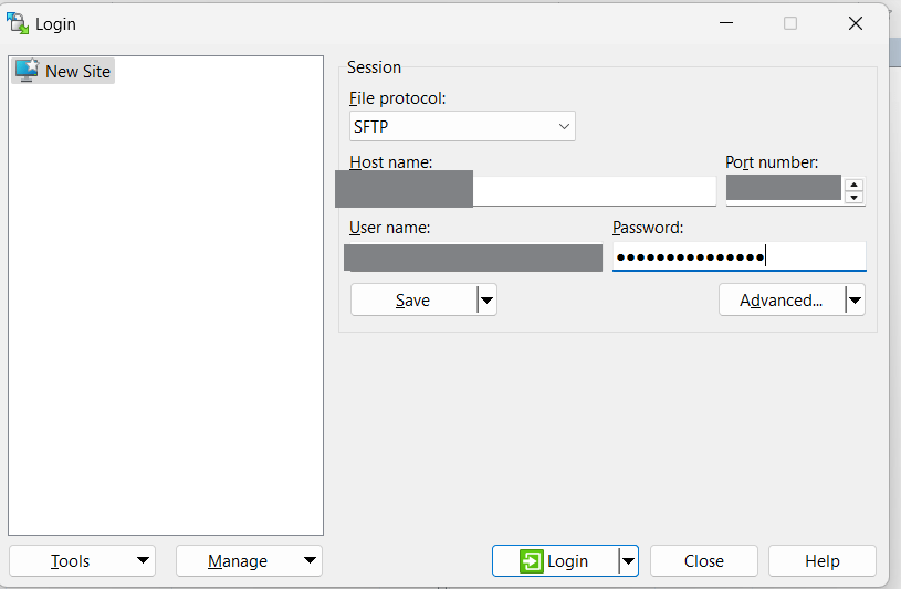 Now open up WinSCP. Create a new connection by entering the File Protocol as SFTP, Hostname/IP under Host name. Enter the Port number. Enter the User name and Password and click Login.