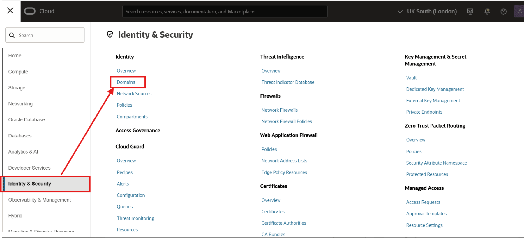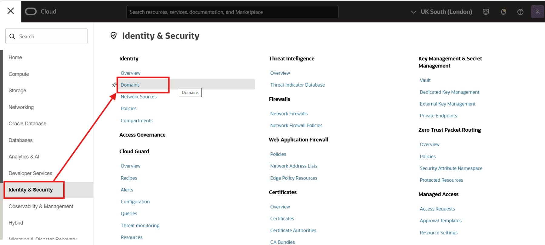 To create an user, login to OCI console using an user having identity domain administrator or user administrator role. Then navigate to Identity & Services > Domains. You can also navigate to Identity & Services > Identity > Users.