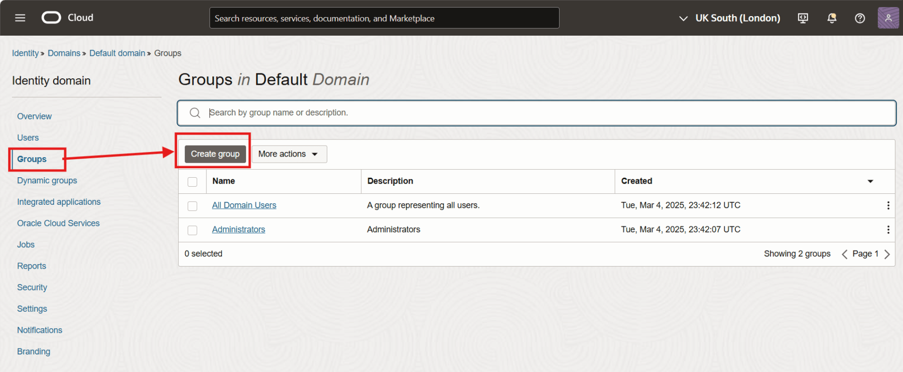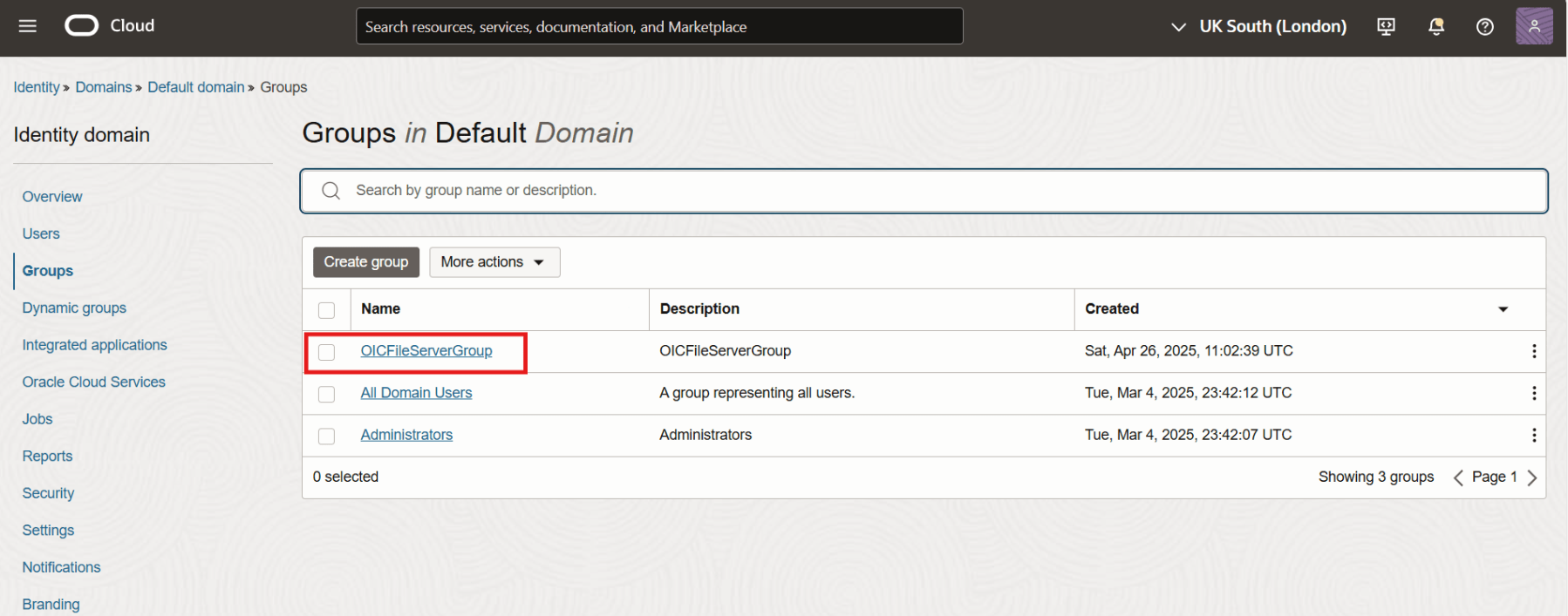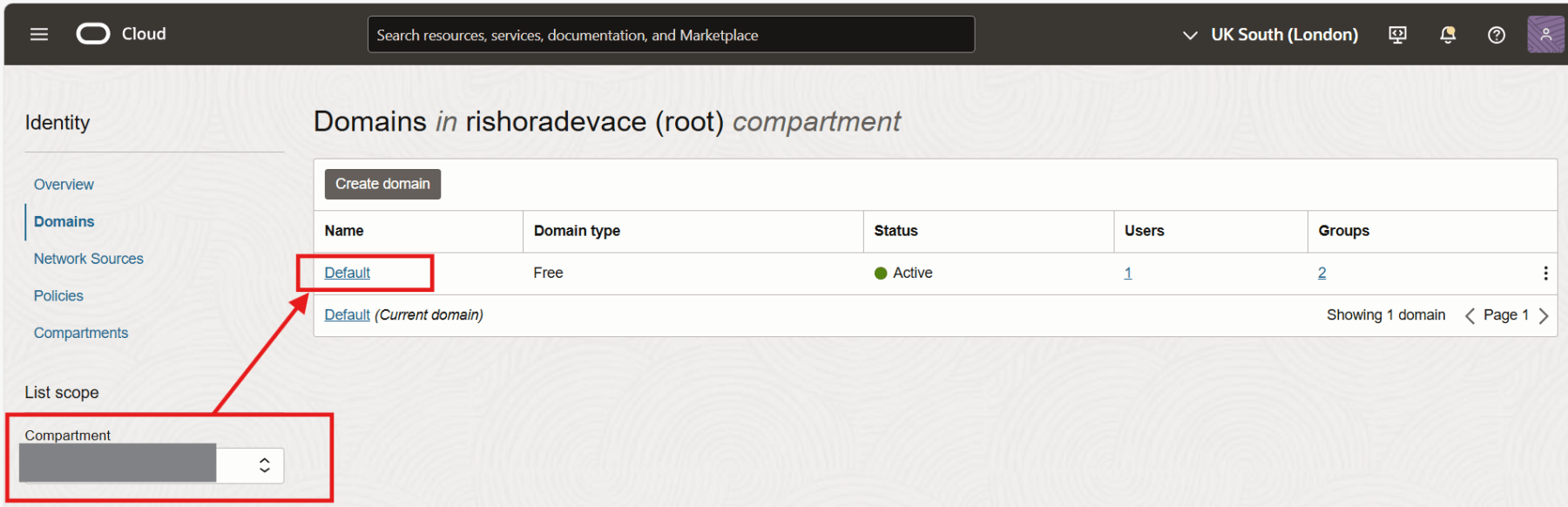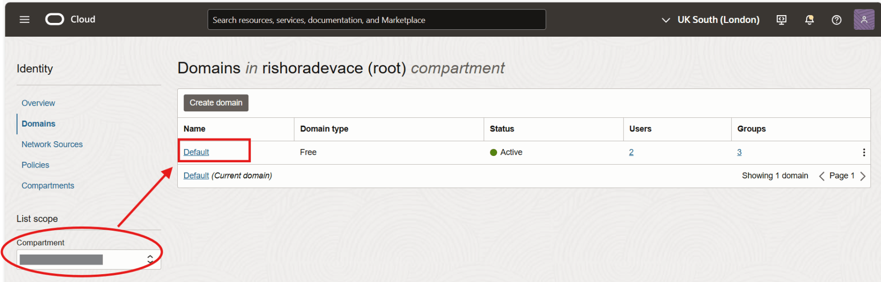 Select the compartment and a list of Domains would be displayed. Click on the domain in which you want to create the group.