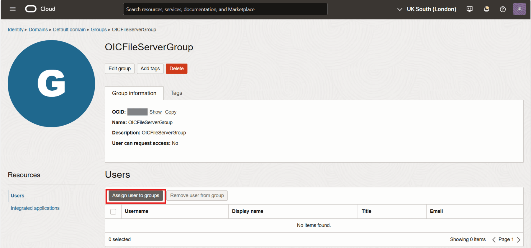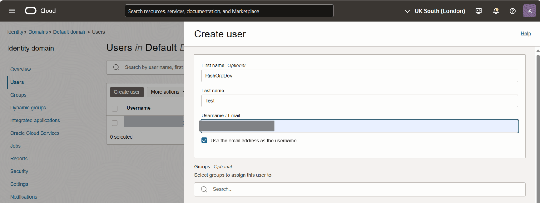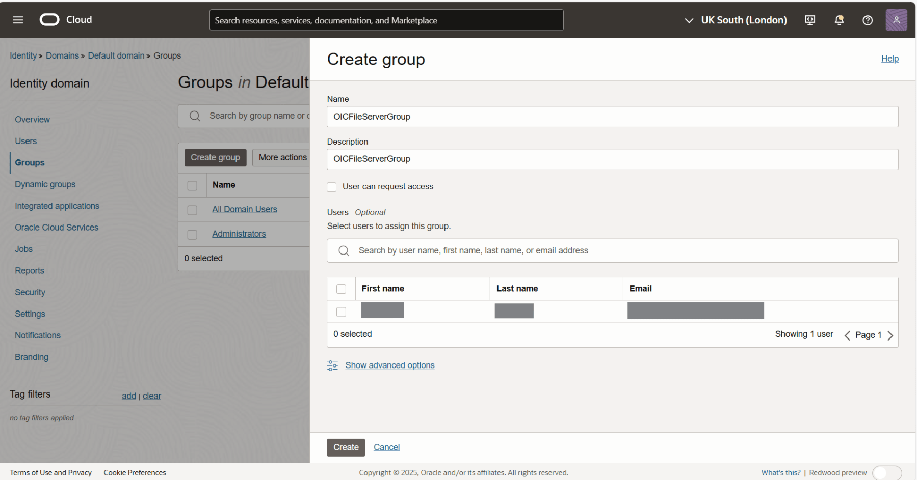 Select the compartment and a list of Domains would be displayed. Click on the domain in which you want to create the group.