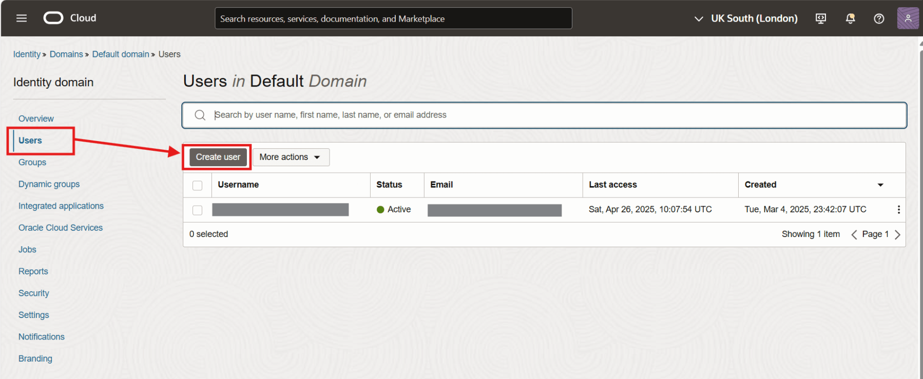 In the domain details page, click on Users. And then click on the Create user button.