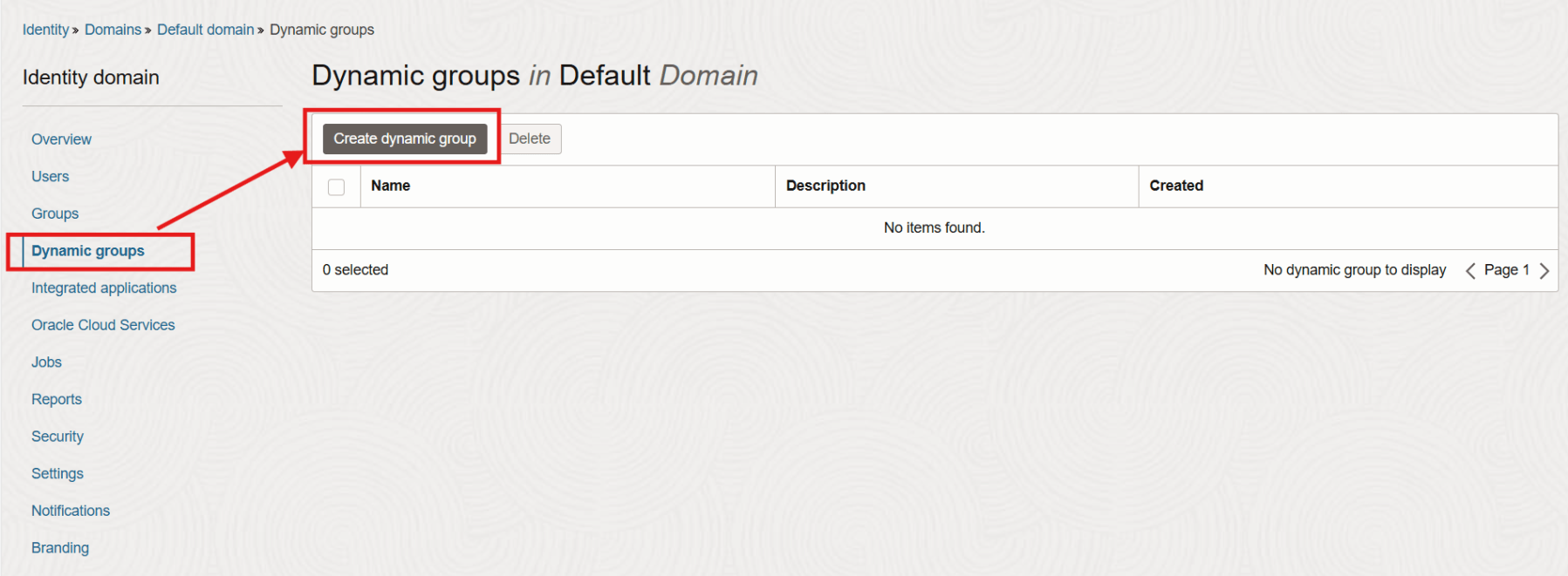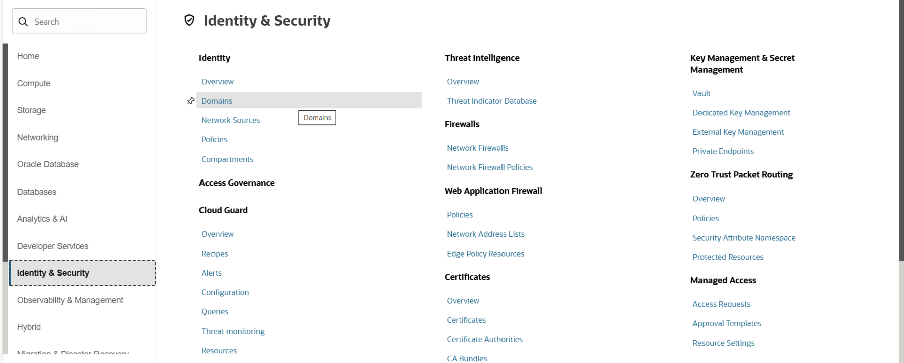 To create a Dynamic Group, from a navigation menu click on Identity & Security > Domains.