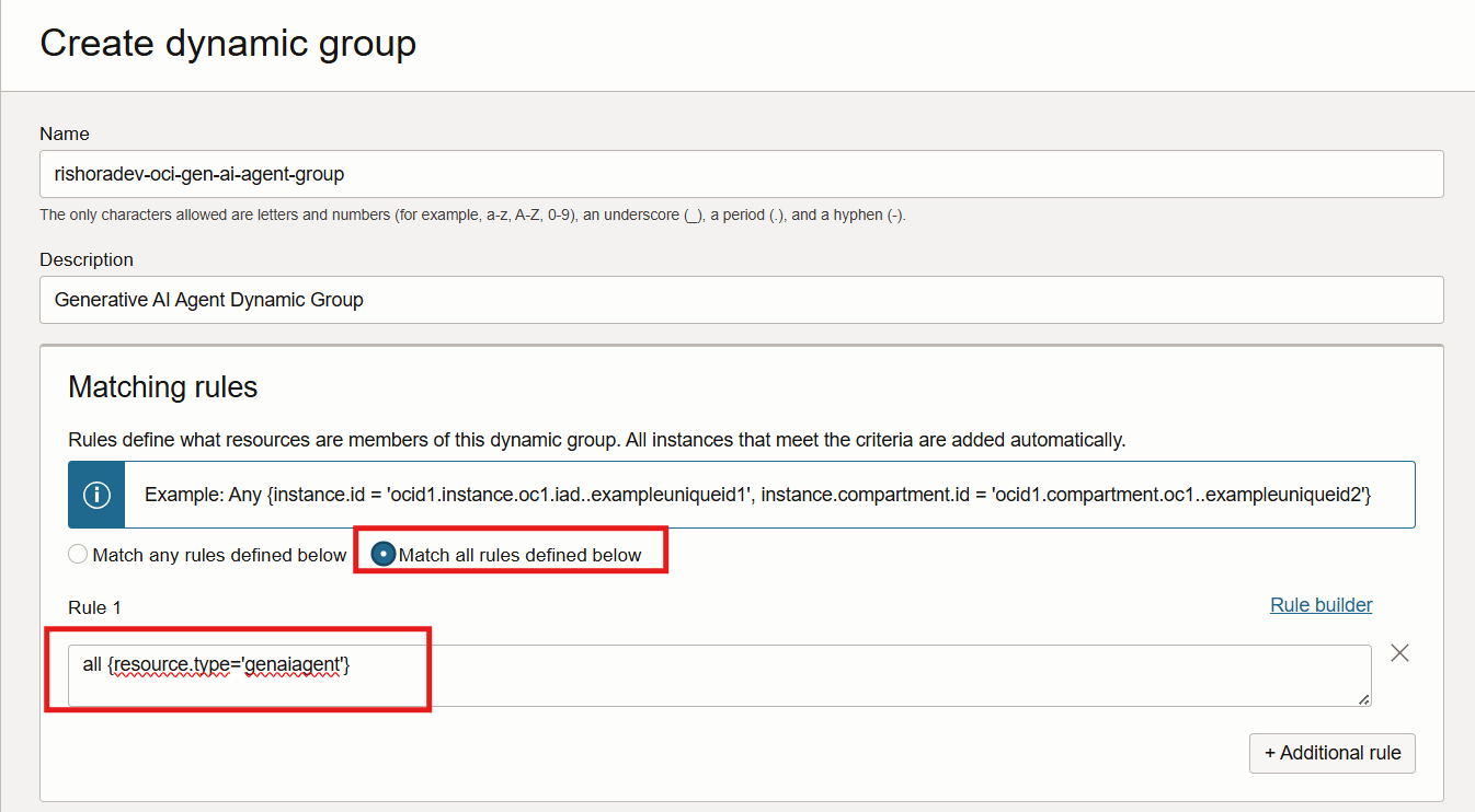 The next step is to create a Dynamic Group. Dynamic groups allow you to group Oracle Cloud Infrastructure instances as principal actors, similar to user groups. You can then create policies to permit instances in these groups to make API calls against OCI services, in the case the Oracle Generative AI Agent Service. Membership in the group is determined by a set of criteria you define, called matching rules.