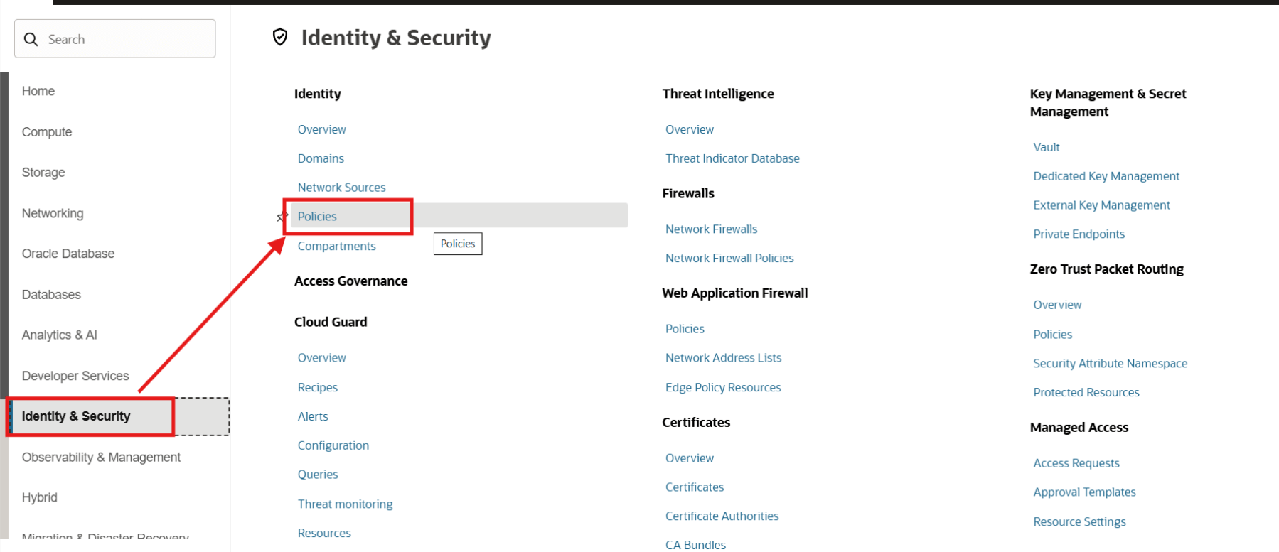 Now that the Dynamic Group has been created, we need to define the access policy. To create the Policy, from the navigation menu, click on Identity & Security > Policies.