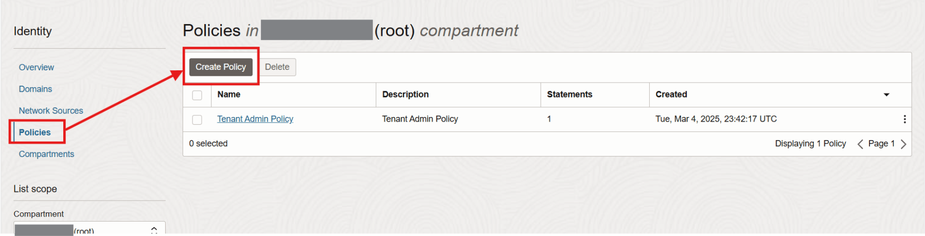 Under Policies, make sure the root compartment is selected. Click on Create Policy.