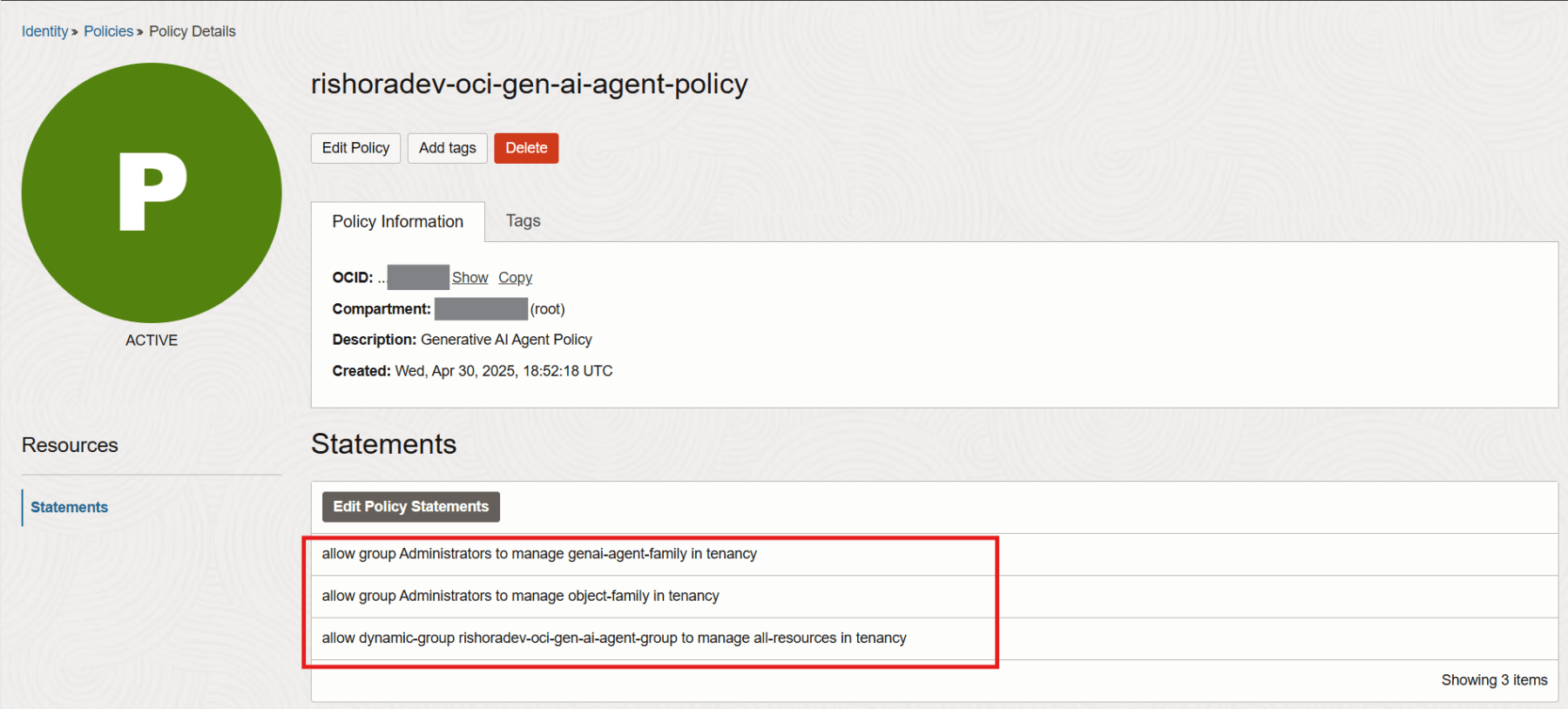 Once the policy is create, the status will change to ACTIVE. You can review or edit the policy statements that you added under Statements.