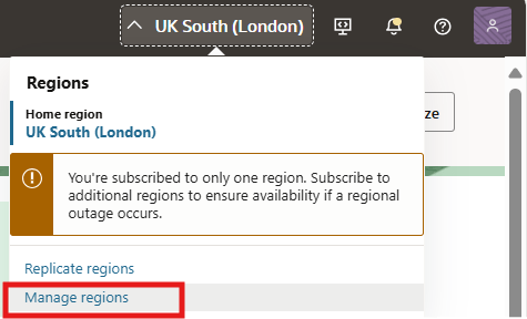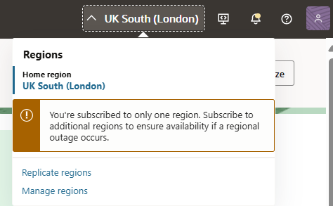 To check the region to which your tenancy is subscribed, login to your OCI Console and click on the Regions drop down on the top-right-hand corner.