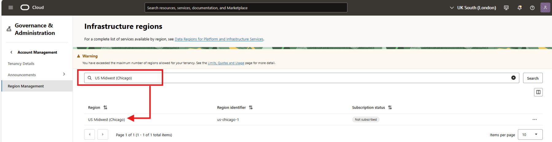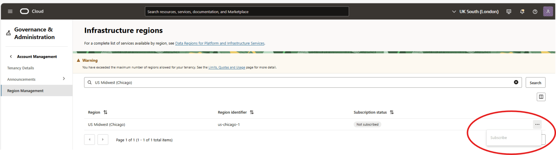- Since I’m using Oracle Free Tier, my tenancy is limited to one subscribed region. Hence the Subscribe option is greyed-out for me.