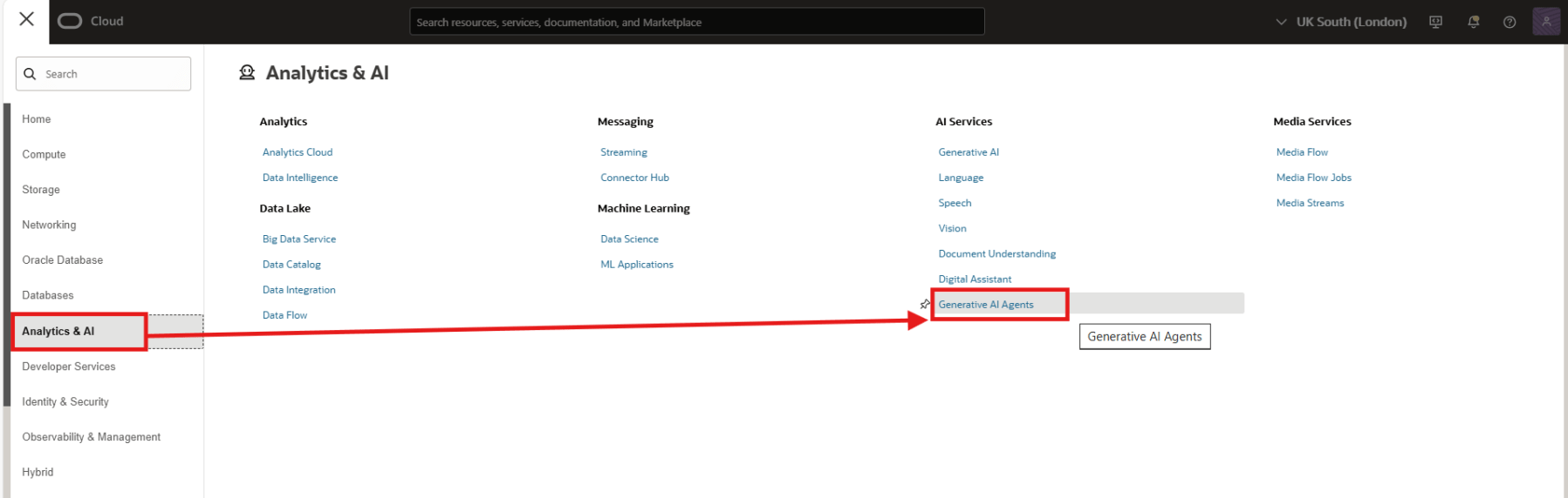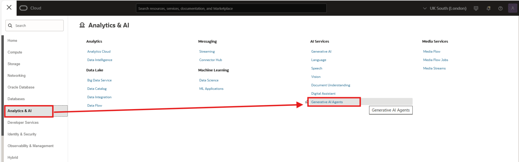 Once you complete all the above tasks, change to the region which you used. Now from the navigation menu, click Analytics & AI > AI Services > Generative AI Agents.