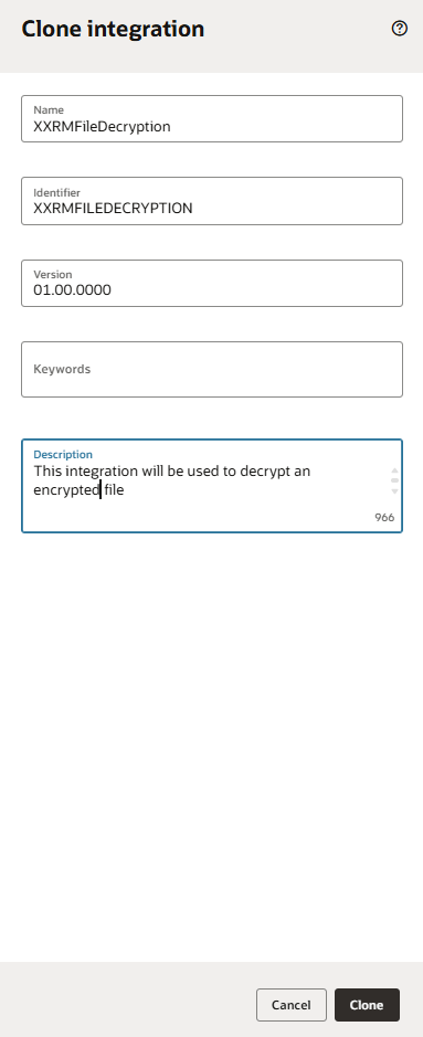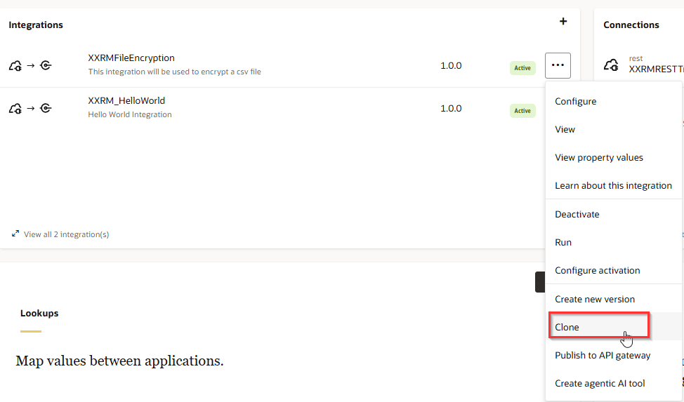 For this demo, instead of creating a new integration, we’ll clone the “Decrypt File” orchestration and make necessary changes. Navigate to Integrations > Integrations. Click on Clone.