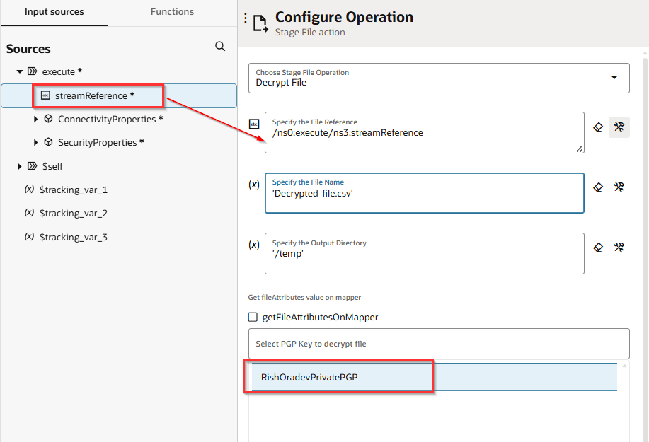 Select Decrypt File Operation. Add the File Reference, File Name and Output Directory. Select the Private PGP Key uploaded earlier.