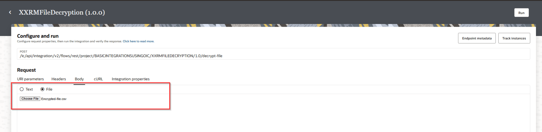 Now click on Run. For the request body, upload your encrypted file. Run the integration.