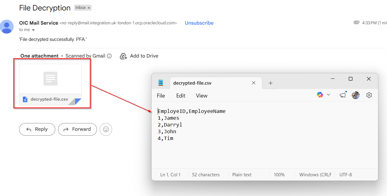 To confirm that the integration has worked, I would expect an email with the decrypted file attached. And voila!!!