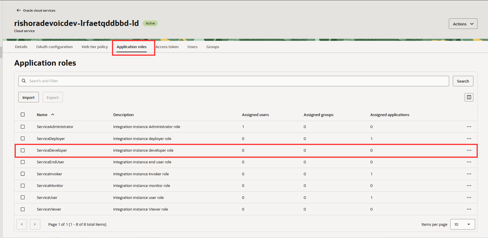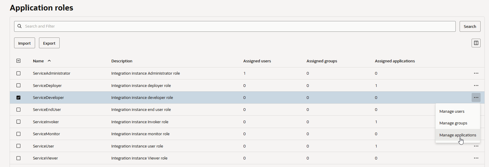 Navigate to Application Roles. Assign ServiceInvoker role and ServiceDeveloper role to the confidential client Application using Manage Applications. This allows the application to invoke OIC integrations. At minimum, the ServiceInvoker role is required. Additional roles may be needed depending on the integration.