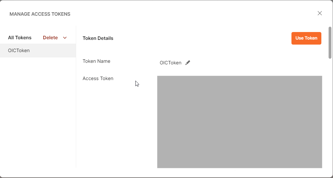 If all the validations are correct, a new Access Toke will be generated. Click on Use Token to use this token for the OIC REST API call.
