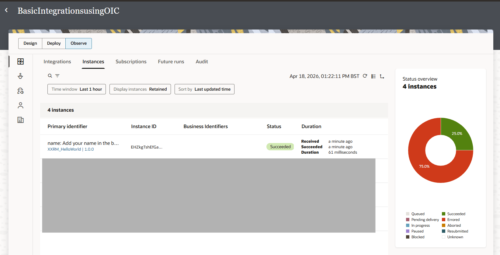Also login to your OIC console and verify the integration invocation from the Instances tab under Observability.