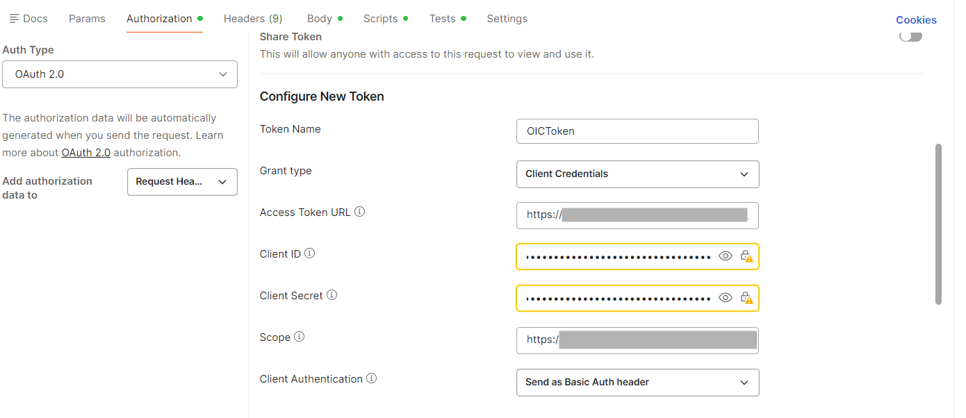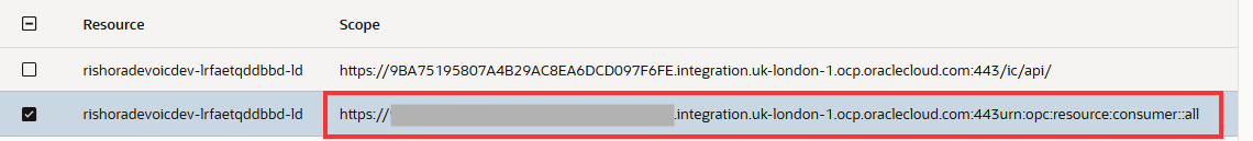 | Scope | https://XXXX.integration.uk-london-1.ocp.oraclecloud.com:443urn:opc:resource:consumer::all |