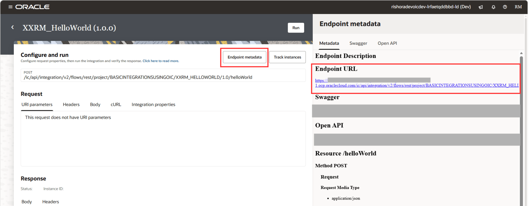 For invoking your OIC REST API, enter the endpoint URL for your OIC integration. If you don’t know where to locate it, go to the Run section of your integration in Oracle Integration Cloud and click Endpoint Metadata to retrieve the details.