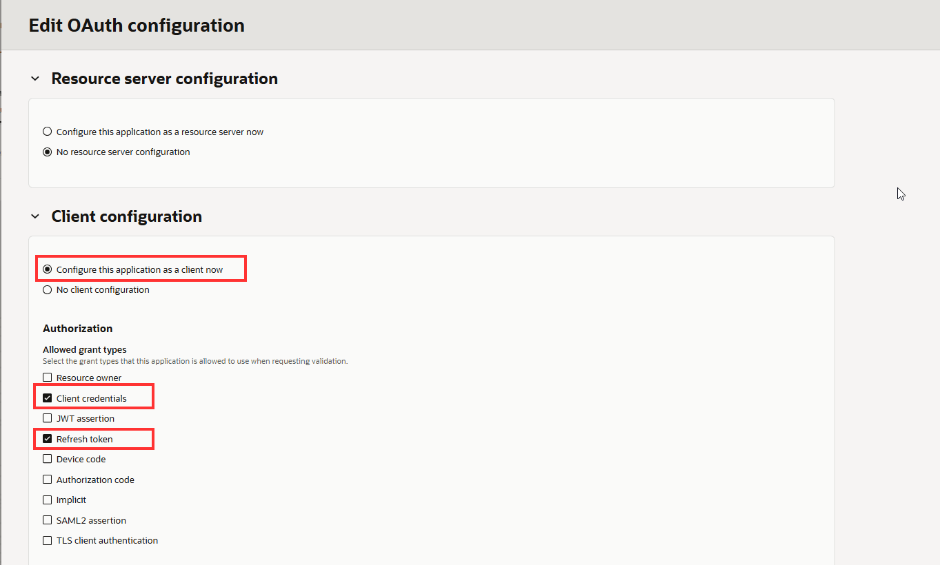Since we are setting up a client configuration, select Configure this application as a client now. This will expand the configuration panel. While multiple grant types can be configured for an application, this guide focuses specifically on the Authorization Code flow. Select Client credentials and Refresh token.