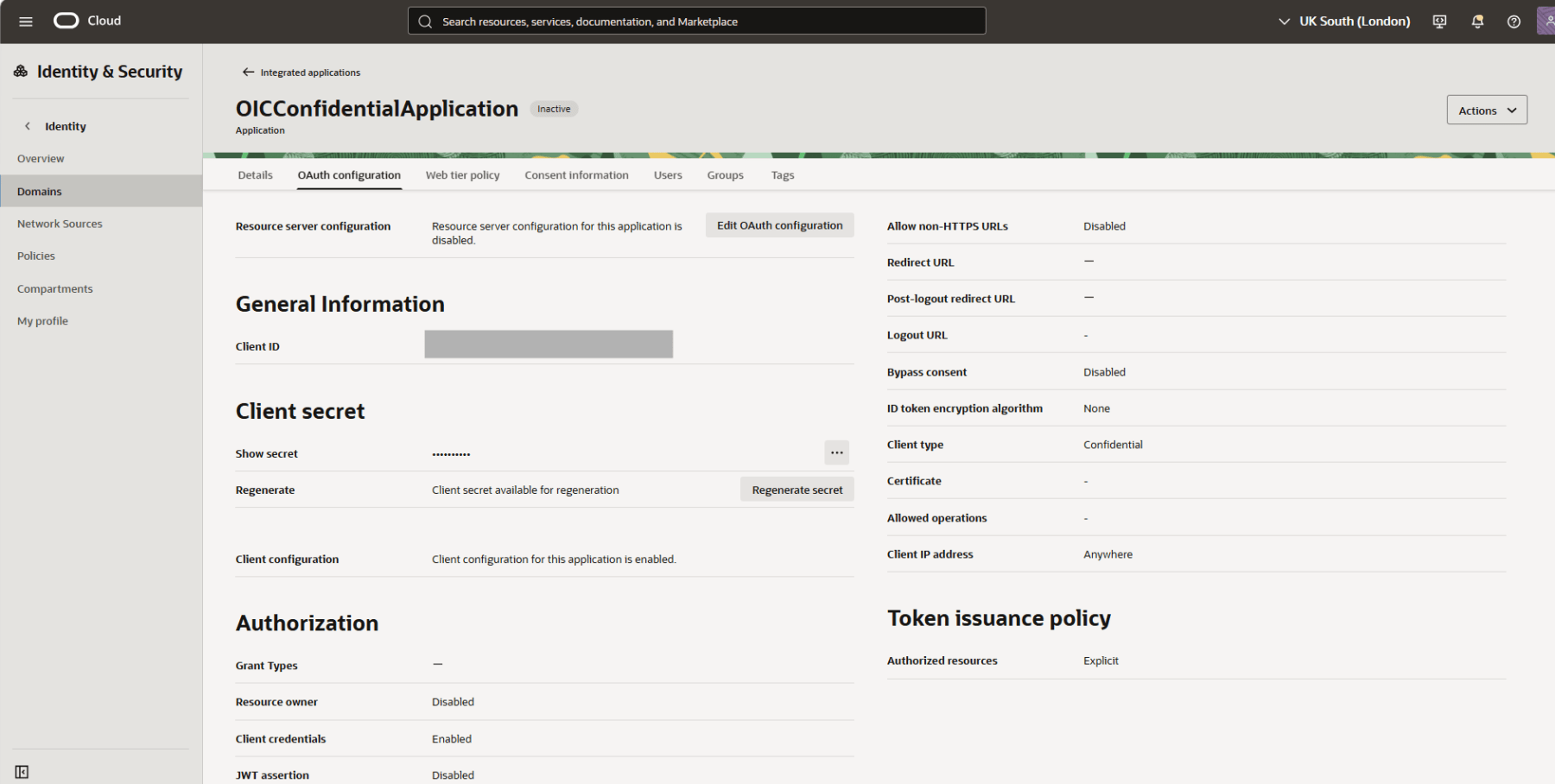 A confidential application is a secure client that can safely store credentials such as a client ID and client secret. It enables Intelligent Advisor to authenticate with Oracle Identity Cloud Service (IDCS) and securely invoke integrations in OIC.