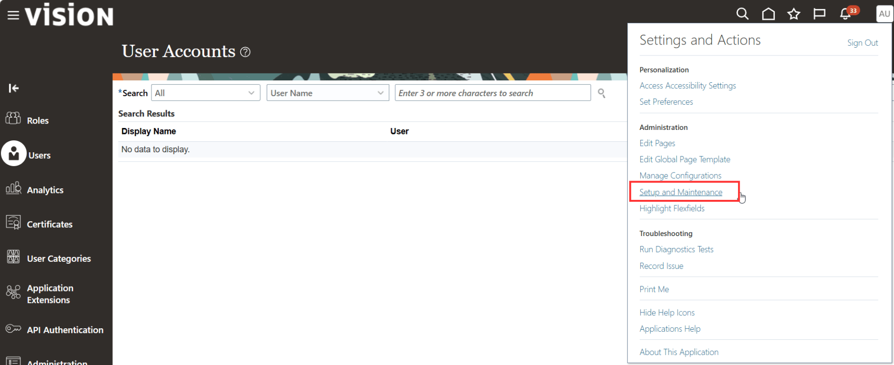 Firstly we need to make the Security Console work with permission groups and related objects. In order to do that, we need to set a profile option. To do that, navigate to Setup and Maintenance.