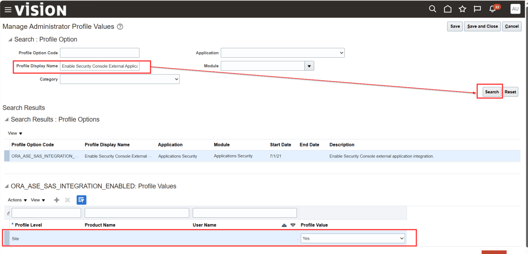 In the Manage Administrator Profile Values page, search for the profile option Enable Security Console External Application Integration (ORA_ASE_SAS_INTEGRATION_ENABLED). Set the profile Value to Yes at the Site level.