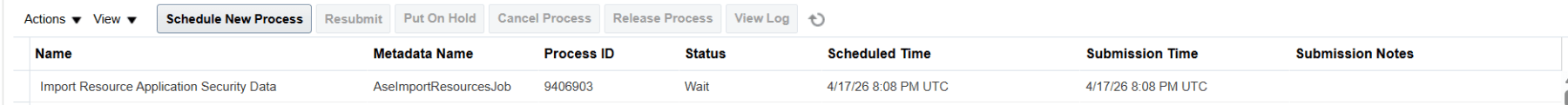 Click Schedule New Process. Execute the Import Resource Application Security Data ESS Job.